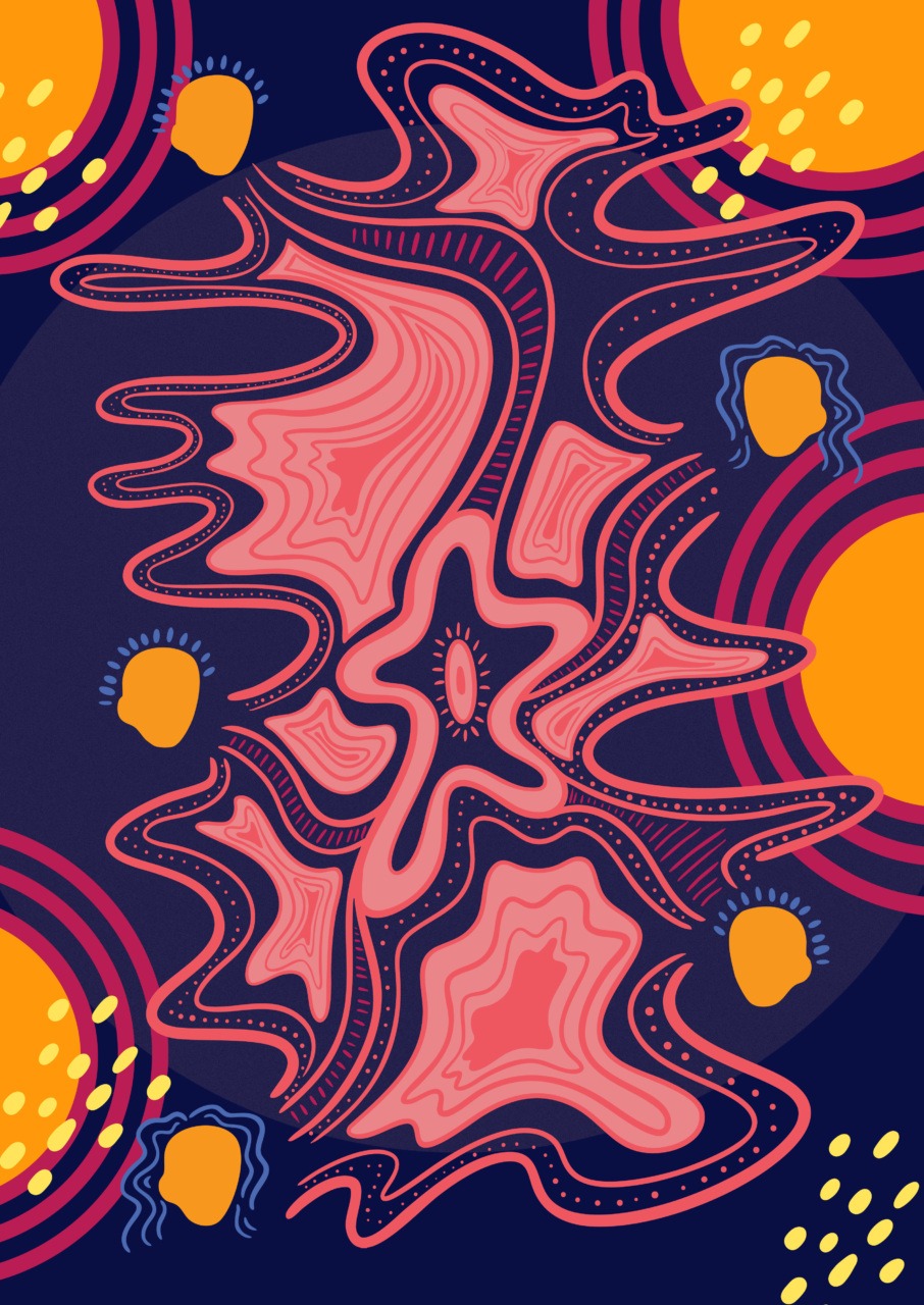 “I like how it combines traditional elements with Molly’s modern style, a reminder of an Acknowledgement of Country: respect for the country that was and always is Aboriginal land, alongside the Elders past and present. This piece reflects stem cell donation by showing a central life force, flowing through various people and communities.”